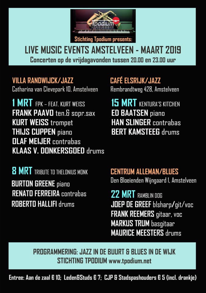 In het kader van de serie JAZZ IN DE BUURT – AMSTELVEEN zal op vrijdag 1 maart in ‘VILLA RANDWIJCK’ het optreden plaatsvinden van FRANK PAAVO KWARTET – FEAT. KURT WEISS Sinds saxofonist/componist Frank Paavo zijn CD ‘JAZZ PAINTER’ in 2017 uitbracht, heeft zijn carrière een flinke ontwikkeling doorgemaakt. Jazzkenners zijn vaak aangenaam verrast om…
